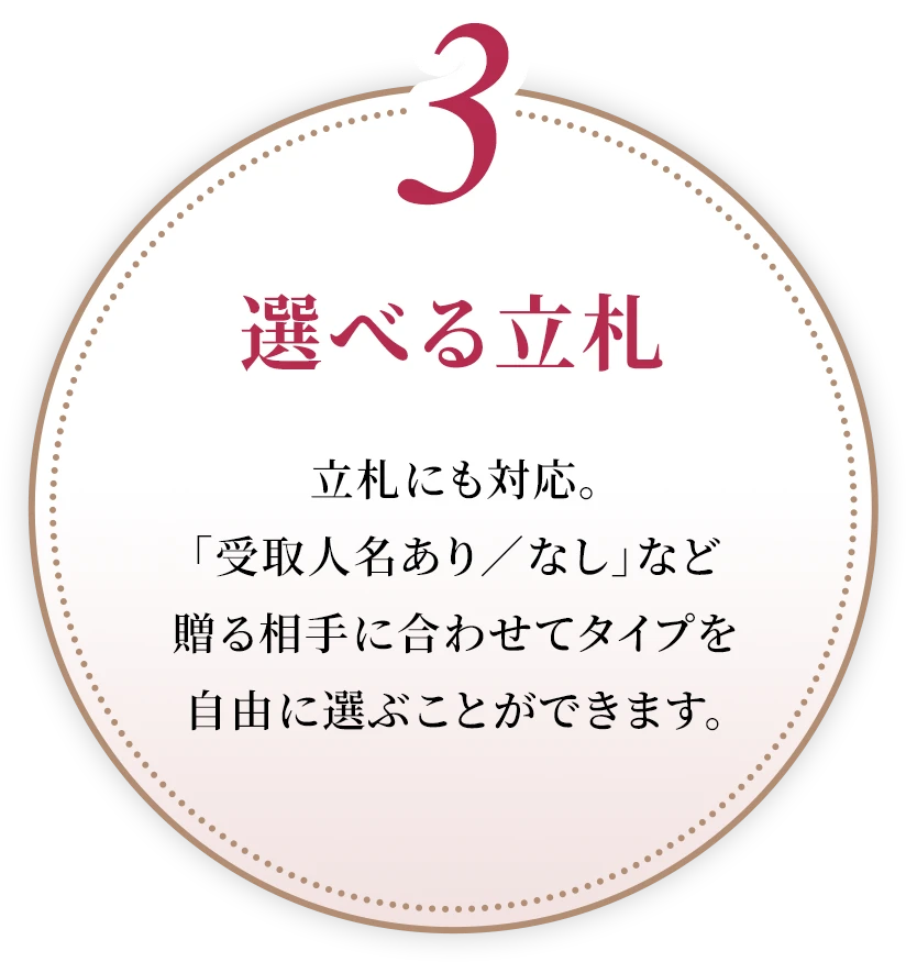 ⽴札は「受取⼈名あり/なし」を、贈る相⼿やシーンに合わせて⾃由にお選びいただけます。