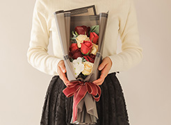 深紅のバラをメインにシックな色合いでまとめた花束タイプのソープフラワー電報。卒業式などの祝電には、式の後も飾って楽しめる華やかなフラワーギフトが人気です。本物の花と見間違えるほど精巧につくられたソープフラワーの花束は、お手入れの必要が無く長持ちするため、お部屋のインテリアとして楽しめます。